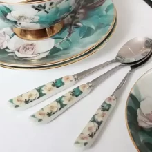 This delicate bone china tea set is lovely, featuring beautiful colors that complement my decor. From the teapot to the spoons, everything is quite pretty. Would definitely purchase again.