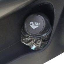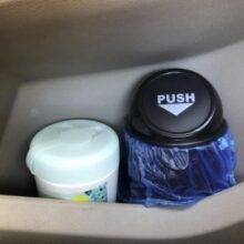 Made from non-toxic ABS plastic, our little trash bin mimics the look of large, full-sized trash cans, with a “PUSH” logo at the lid opening. The can fits right into a standard-sized cup holder for a trash bin for snack wrappers right within your reach. The can measures 7.9 x 2.7 inches (L x W).